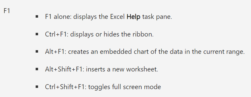 - F3: displays the Paste Name dialog box. Available only if names have been defined in the workbook.